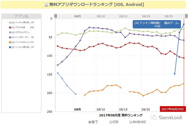 根据日本手游网站Gamerch.com提供的数据显示,《神回避2》8月27日日本市场正式发布后,加上iOS和安卓版本一同计算,3天时间内在日本免费应用下载榜单中到达第15名,平均每天攀升44名。《神回避2》在国内已经拥有病毒式传播的条件,相信短时间内就能迅速超过在日本获得的成绩。 |
